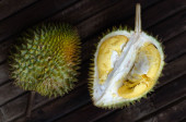 Durian owoców żółty na drewniane tła
