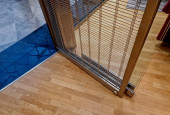 szklane drzwi bez ramki. przeszklone przegrody posiadają specjalne zawiasy i uchwyty. wszystko jest wiercone w szkle i zamocowane śrubami ze stali nierdzewnej. polerowana rączka