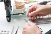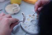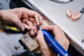 Zbliżenie technika dentystycznego przy użyciu narzędzia obrotowego do kształtowania i uszlachetniania zębów protetycznych w warunkach laboratoryjnych.