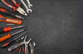 mechanical kit in wooden background. construction tool with a co