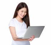 Asian young woman holding tablet and showing thumb up