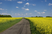 Samotny drogowego między polami żółty rzepak (Brassica napus) f