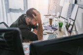 Przemyślany człowiek dopasowuje okulary, koncentrując się na zadaniach w stylowym biurze.