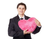 człowiek posiadający zabawka centrum w posiadanie tux czarny krawat na tle