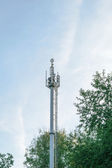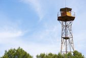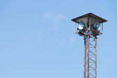 Wieża wysokie oświetlenie platformę widokową na górze przeciw błękitne niebo z chmurami