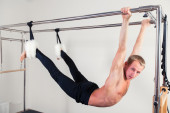 w sali człowiek robi, rozciągający się w pobliżu Barre.
