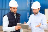 Zdjęcie "Inżynier i pracownik mówiąc o pracy na stacji dokującej" może być wykorzystywane do celów osobistych i komercyjnych zgodnie z warunkami zakupionej licencji Royalty-free. Obraz jest dostępny do pobrania w jakości wysokiej rozdzielczości do 5760x3840.