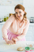A wesoły plus rozmiar kobieta czatuje przez telefon podczas przygotowywania świeżych składników w kuchni.