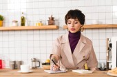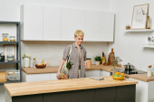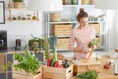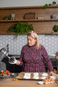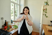 Plus size kobieta cieszy siekanie warzyw na kolorowe sałatki w ciepłej kuchni ustawienie.