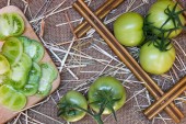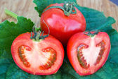 Wiśniowe pomidory z zielonych liści na drewniane tła
