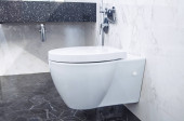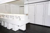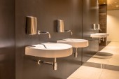 Zdjęcie "Przestronna łazienka prezentuje elegancki, nowoczesny zlewozmywak z podwójnymi bateriami i minimalistyczną estetyką. Mrożone szklane przegrody dodają prywatności, tworząc współczesną atmosferę dla użytkowników." może być wykorzystywane do celów osobistych i komercyjnych zgodnie z warunkami zakupionej licencji Royalty-free. Obraz jest dostępny do pobrania w jakości wysokiej rozdzielczości do 5760x3840.