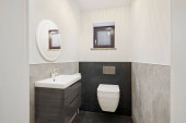 Przestronna łazienka prezentuje elegancki, nowoczesny zlewozmywak z podwójnymi bateriami i minimalistyczną estetyką. Mrożone szklane przegrody dodają prywatności, tworząc współczesną atmosferę dla użytkowników.