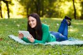 Kobieta jest myślenie o czymś podczas czytania książki