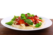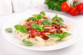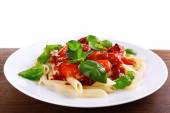 Makaron z sosem pomidorowym i bazylią na jasnym tle