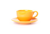 pomarańczowy ceramicznych filiżanka i spodek na białym tle.
