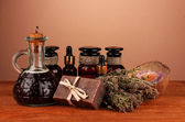 zioła, owoce, kwiaty i tabletki na kolor drewniany stół tło