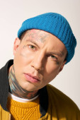 Zdjęcie "Młody mężczyzna z wybitnymi tatuażami relaksuje się w przytulnym wnętrzu, ciesząc się zaufaniem." może być wykorzystywane do celów osobistych i komercyjnych zgodnie z warunkami zakupionej licencji Royalty-free. Obraz jest dostępny do pobrania w jakości wysokiej rozdzielczości do 5760x3840.