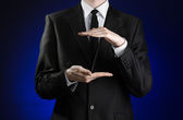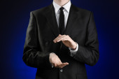Businessman and gesture topic: a man in a black suit and white shirt showing gestures with hands on a dark blue background in studio isolated