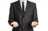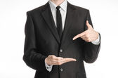 Businessman and gesture topic: a man in a black suit and white shirt showing gestures with hands on a dark blue background in studio isolated
