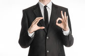 Businessman and gesture topic: a man in a black suit and white shirt showing gestures with hands on a dark blue background in studio isolated