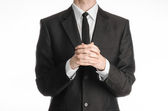 Businessman and gesture topic: a man in a black suit and white shirt holds up a hand against the dark blue isolated background in studio