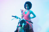 Roken elegante vrouw die zich voordeed op haar motorfiets