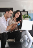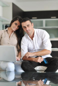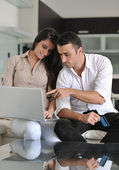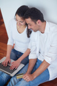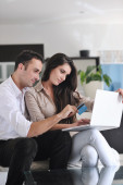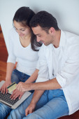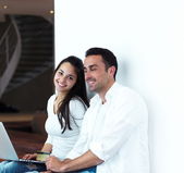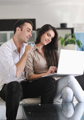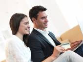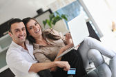 radosna para zrelaksować się i pracować na laptopie w nowoczesnym domu
