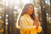 Dojrzała kobieta z siwymi włosami medytuje spokojnie na świeżym powietrzu w naturalnym otoczeniu podczas zachodu słońca. Spokojna i spokojna scena podkreśla związek z naturą i osobistą uważnością.