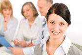 biznes drużyna stojący szczęśliwy w linii portret