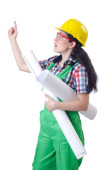 Kobiece robotnika w zielony kombinezon na białym tle