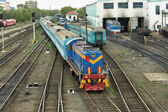 Orel (Rosja) w 19 czerwca 2015 - Diesel typ Chme3t-7451 jest na szynach przy stacji kolejowej. Widok z góry z przodu po lewej stronie