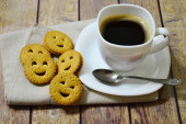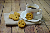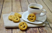 Filiżankę kawy na drewniane deska i herbatniki kolor vintage