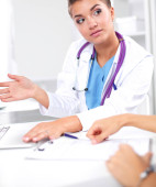 Młoda lekarka badająca zdjęcie rentgenowskie siedząca na biurku