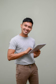 Zdjęcie "Młody człowiek Asian gospodarstwa cyfrowy dotykowy ekran typu tablet komputer o" może być wykorzystywane do celów osobistych i komercyjnych zgodnie z warunkami zakupionej licencji Royalty-free. Obraz jest dostępny do pobrania w jakości wysokiej rozdzielczości do 5760x3840.