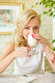 Blond kobieta wylewanie filiżankę herbaty i uśmiechnięty. Strzał w caf