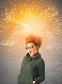 Młoda kobieta z fryzurą i ręcznie rysowane błyskawice