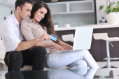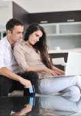 radosna para zrelaksować się i pracować na laptopie w nowoczesnym domu