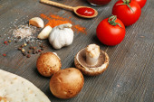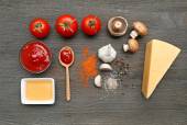składniki do gotowania pizza na drewnianym stole, widok z góry