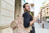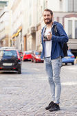 Attractive young hipster guy is walking across city