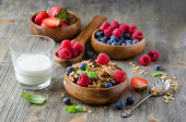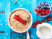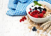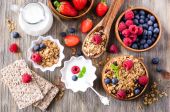 Zdrowe śniadanie z musli, świeże owoce, pieczywo chrupkie i whe