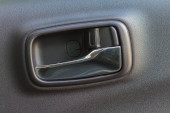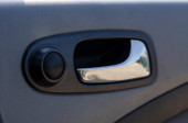 Zbliżenie klamki drzwi samochodu podkreślające chromowanie i przyciski sterujące. Idealny do projektowania samochodów i wyposażenia wnętrz.