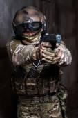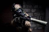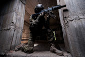 Żołnierz ukrywanie w betonie za pokrycie gdzie klęcząc w drzwiach z bronią w ręku