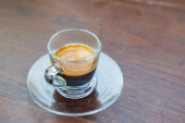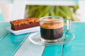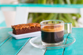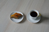 Kubek kawa i ciasto na stary drewniany stół na śniadanie