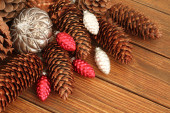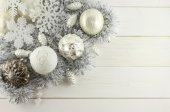 Boże Narodzenie ozdoba - srebrny kulki, srebrny szyszki, białe płatki śniegu, srebrne wisiorki z pióro, srebrne pióra, srebrny wianek na białym tle drewniane