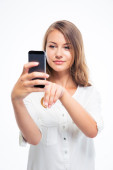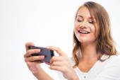 Zdjęcie "Uśmiechnięta młoda dziewczyna gospodarstwa smartphone" może być wykorzystywane do celów osobistych i komercyjnych zgodnie z warunkami zakupionej licencji Royalty-free. Obraz jest dostępny do pobrania w jakości wysokiej rozdzielczości do 5760x3840.
