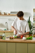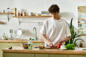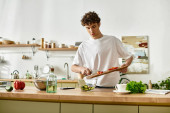 Zdjęcie "Przystojny młody człowiek z kręconymi włosami sprząta swój stylowy blat kuchenny w domu" może być wykorzystywane do celów osobistych i komercyjnych zgodnie z warunkami zakupionej licencji Royalty-free. Obraz jest dostępny do pobrania w jakości wysokiej rozdzielczości do 5760x3840.