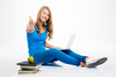 Dziewczyna za pomocą laptopa w słuchawkach na podłodze