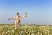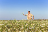 Szczęśliwy młody człowiek w polu z bukietem camomiles
