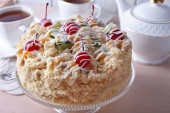Pokoju, smaczne ciasto masło na talerzu, kubki herbaty na kolor drewniane tła