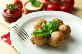 Kulki mięsne z sosem pomidorowym, drewnianą łyżką na drewniane tła